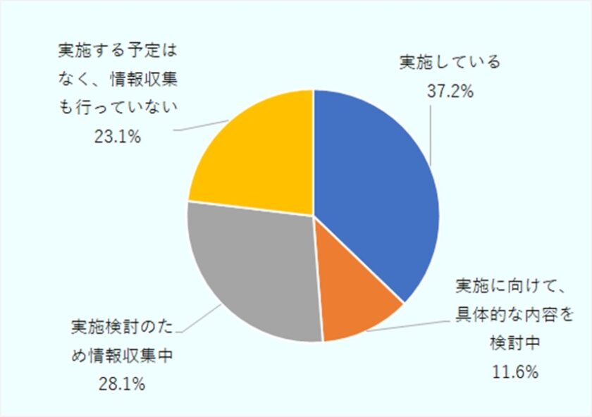未実施の企業でも、実施に向け、具体的な内容を検討している企業や情報収集を行っている企業も多く、合わせて4割近い企業が検討等を行っていることが分かります。