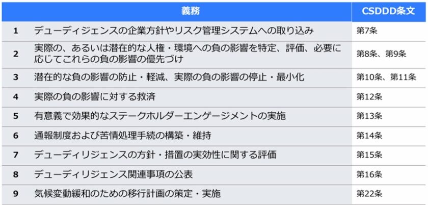 さらに、CSDDDには、人権・環境に関するリスクへの対応のほか、気候変動緩和のための移行計画の策定・実施も求められている点も大きな特徴の一つと言えます[*9]。