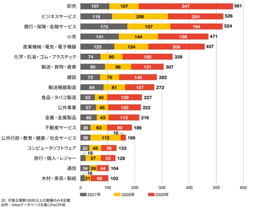 PwCの調査によると、EU域内企業約3,200万社のうち、CSDDDの対象となる企業は5,847社です。業種別に見ると、卸売業が最も多く561社、人材紹介などのビジネスサービス526社、銀行・保険・金融サービス524社が続きます[*1], (図6)。