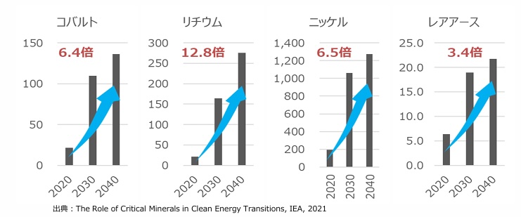 これらの資源は、EVなどの普及によってその需要量が増加することが見込まれています。国際エネルギー機関(IEA)によると、リチウムは2020年から2040年にかけてその需要が12.8倍、コバルトやニッケルはそれぞれ6.4倍、6.5倍になると予想されています[*6, *7], (図2)。