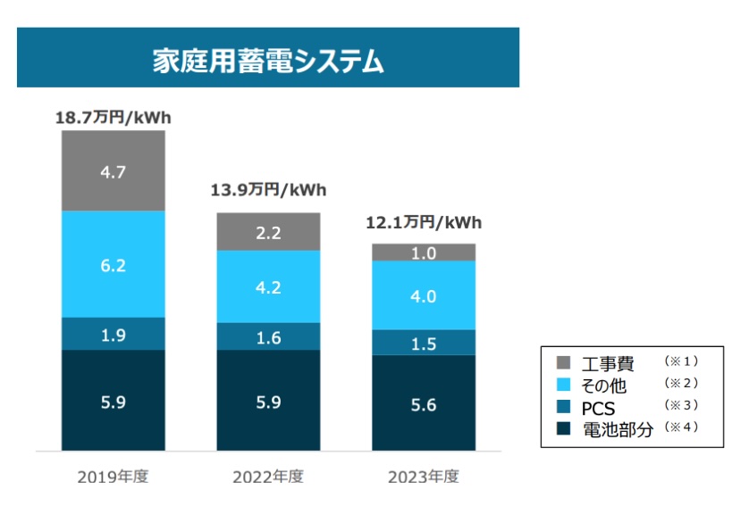 政府は、家庭用蓄電池の導入費用について、2030年までに1kWhあたり7万円を目標としており、今後もさらに低減していく見込みです。
